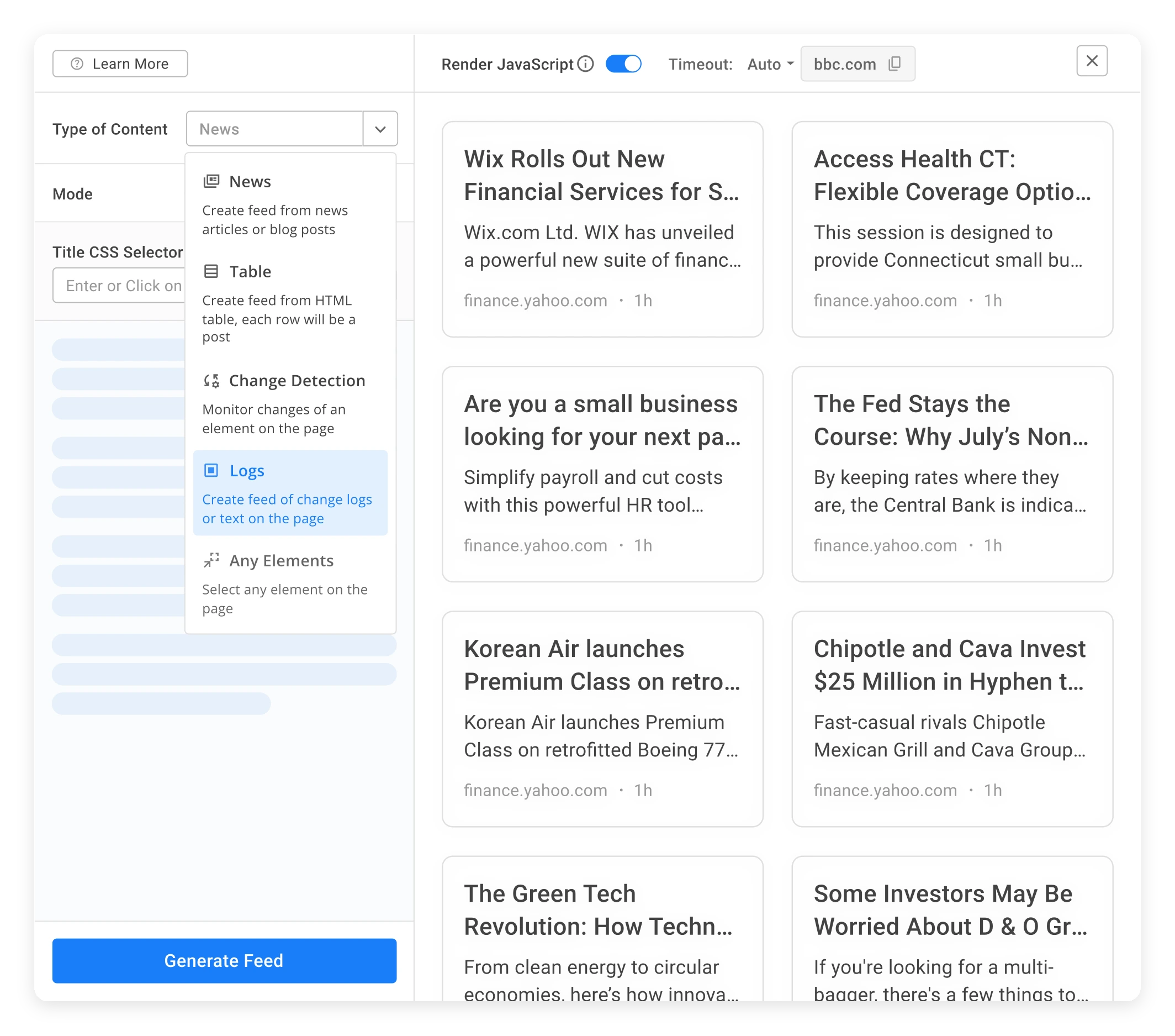 Generate change logs or content feeds from web pages in just a few clicks—no manual work needed.