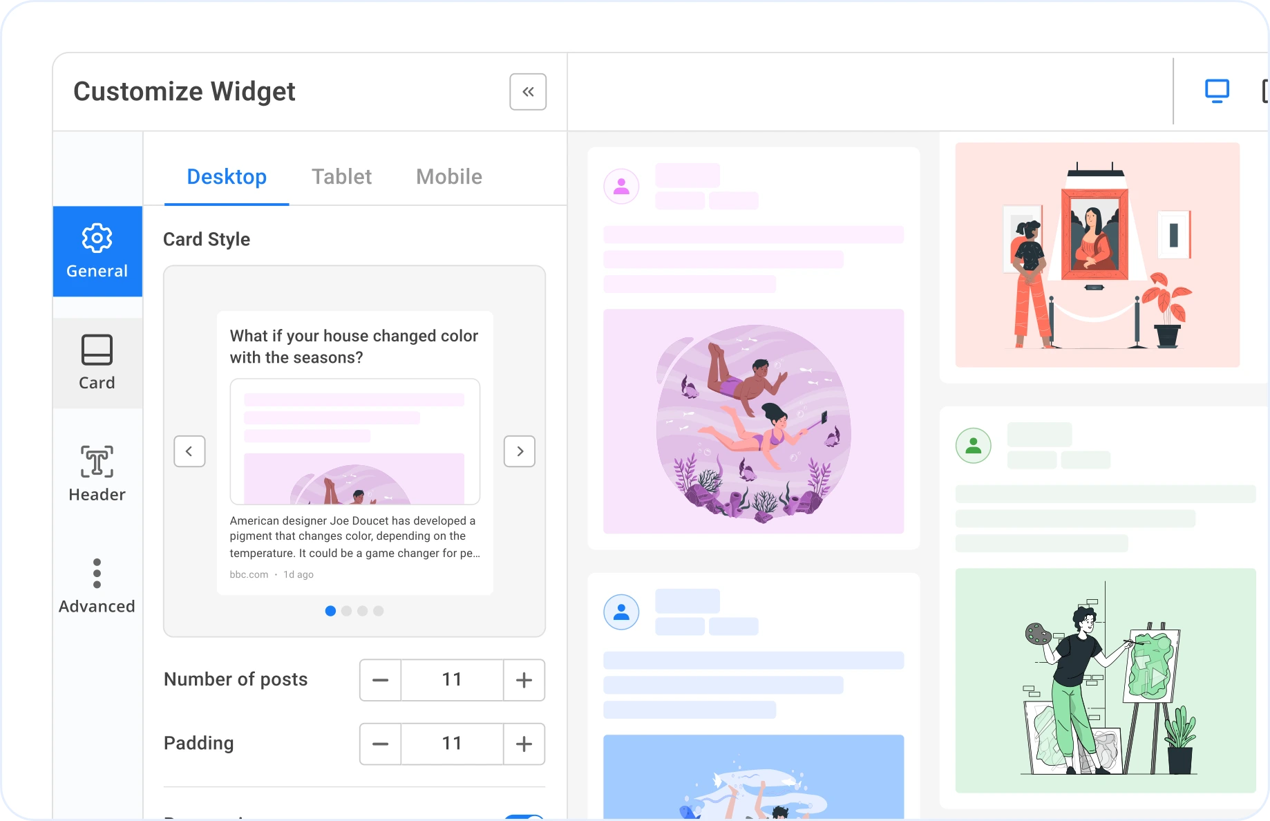 Choose how many cards to show and customize their size, spacing, and alignment.