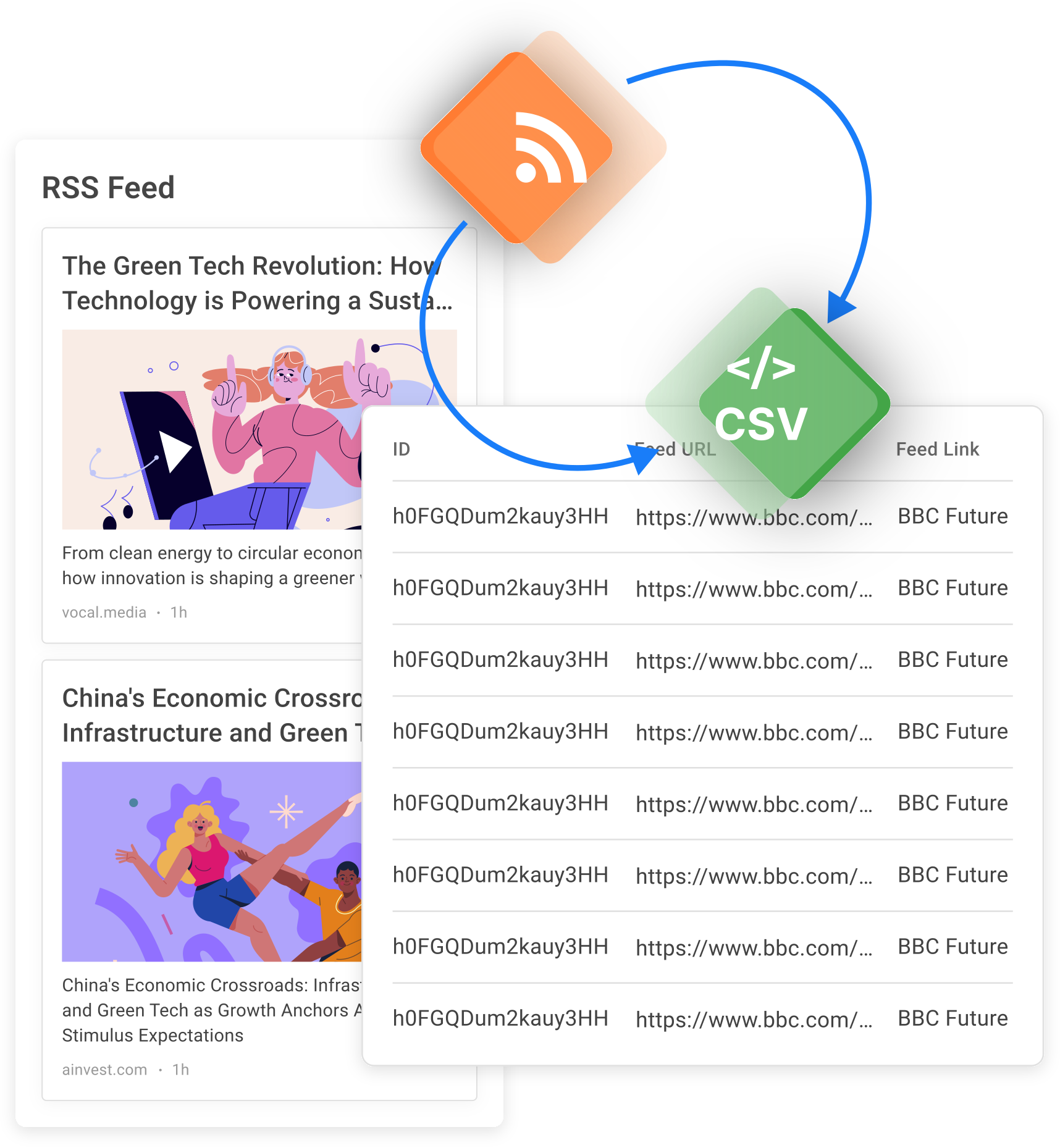 Paste your feed link and get a ready-to-use CSV file for Excel, Google Sheets, or any analytics tool. No coding required.